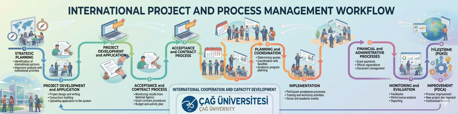 As Çağ University, we manage our international collaborations and capacity-building projects with a strategic approach. This flowchart illustrates our end-to-end process consisting of 8 key steps: starting from Strategic Planning and Project Development, moving through the submission of applications and the completion of Acceptance and Contract procedures, ensuring effective Planning and Coordination, followed by the successful Implementation of the project, management of Financial and Administrative processes, meticulously conducted Monitoring and Evaluation activities, and finally, the Improvement (PDCA) cycle that transforms gained experiences into institutional learning.